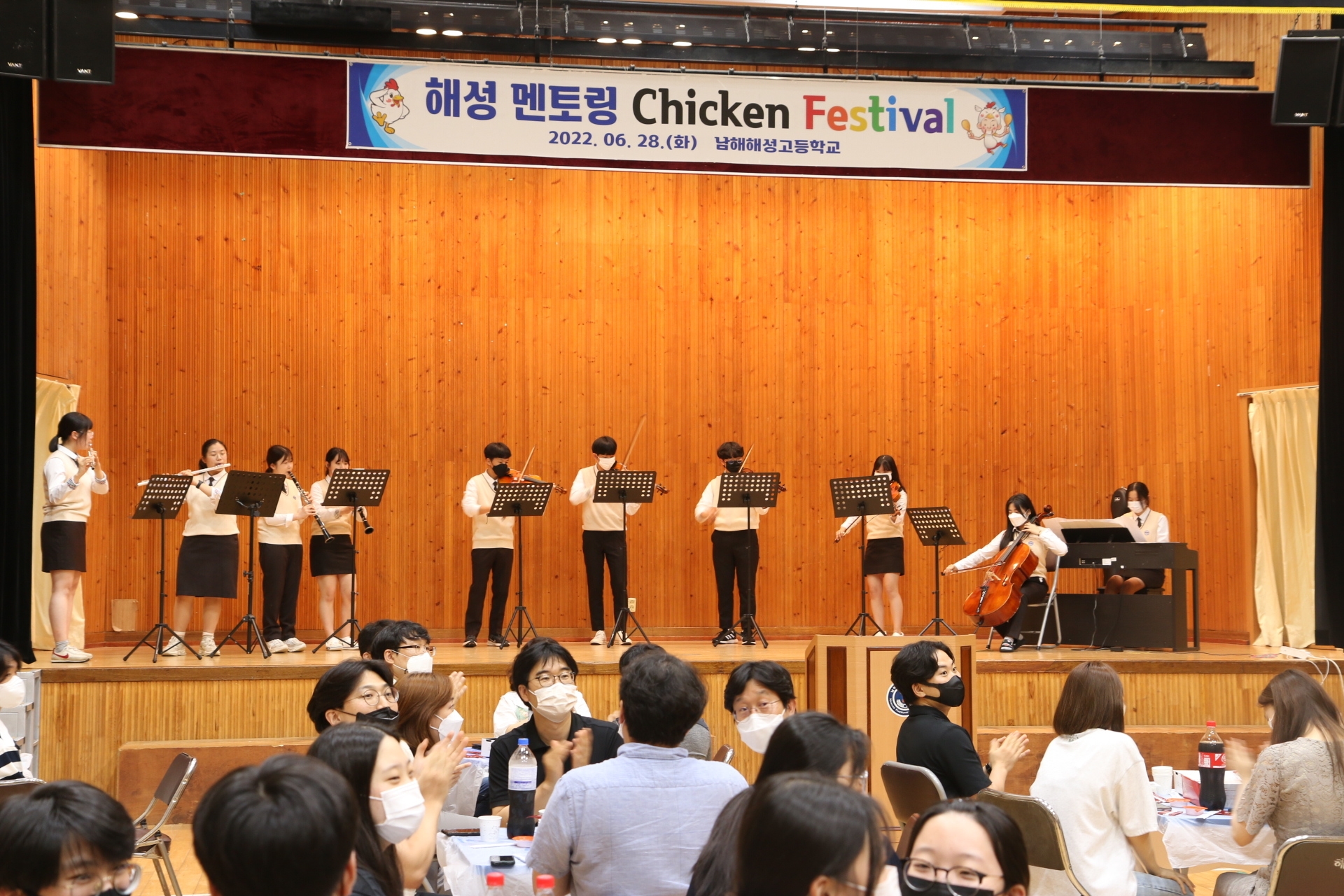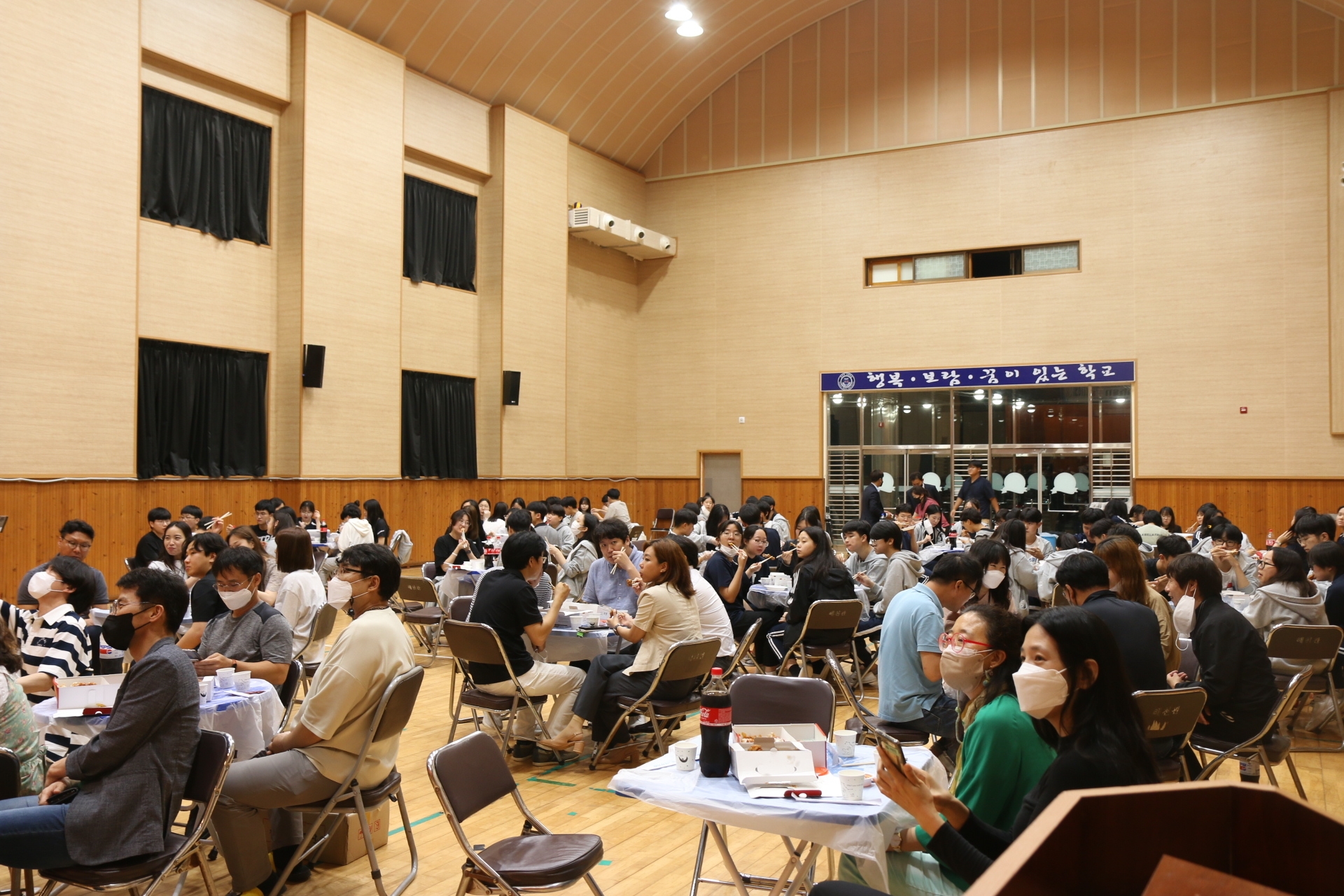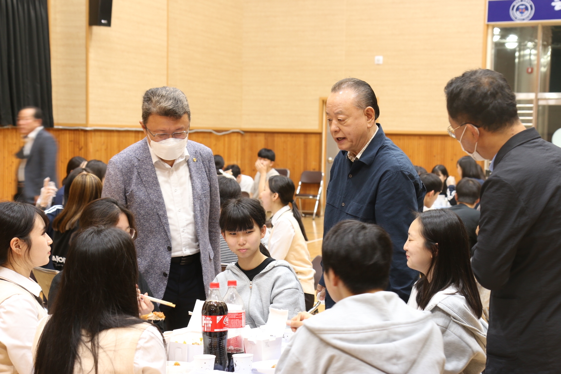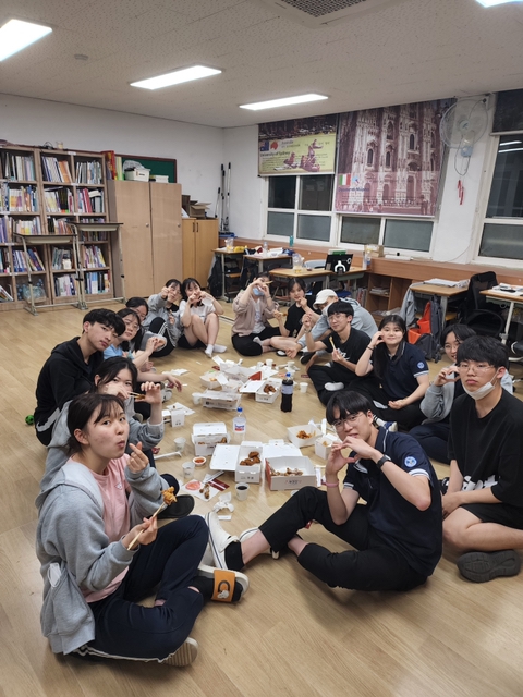 오랜만에 학교법인 해성학원 이중명 이사장님께서 학교 방문을 해주셨습니다. 이번에도 전교생이 먹을 만큼의 치킨을 선물로 사 오셨습니다. 1학년은 해천관에서, 2학년과 3학년은 교실에서 진행하였습니다.