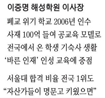 남해해성고의 '변신'은 이중명 아난티그룹 회장(사진)이 하영제 전 남해군수(현 국민의힘 의원) 요청으로 해성학원을 인수하면서 시작됐다. 이 회장은 2006년 해성학원 이사장에 취임한 뒤 100억원이 넘는 사재를 투자하며 남해해성고를 굴지의 명문고로 변화시켰다. 2023년 입시에서 남해해성고는 수시에서만 서울대 8명, 연세대 6명, 고려대 9명의 합격자를 배출했다. 학생 수 대비 서울대 합격자 비율 전국 1위(일반고 기준)다. 지난 16일 이 이사장은 국민 교육 향상에 기여한 점을 인정받아 국민훈장 목련장을 받았다.