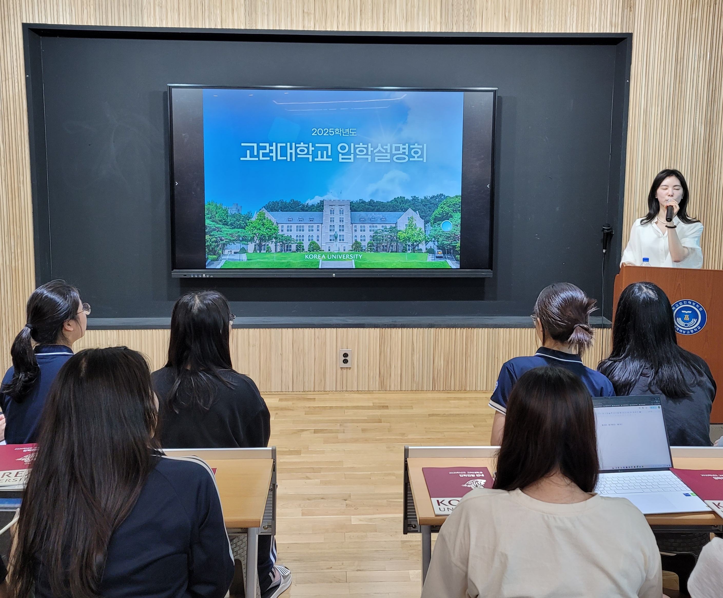 민주교육의 근본이념을 바탕으로 학술이론과 그 응용방법을 연구하는 동시에 국가와 인류사회 발전에 필요한 인재를 육성하는 고려대학교에서 우리 학교를 방문하여 입학설명회를 진행하였습니다.늘 본교에 많은 관심과 조언을 해주시는 정혜진, 서하은, 이하란사정관 3분이 오셨고, 정혜진 입학사정관님께서 2025학년도 입학전형 설명과 전공 안내, 수시 입시전략, Q&A 등 고려대 입시에 대한 많은 정보를 주셨습니다.