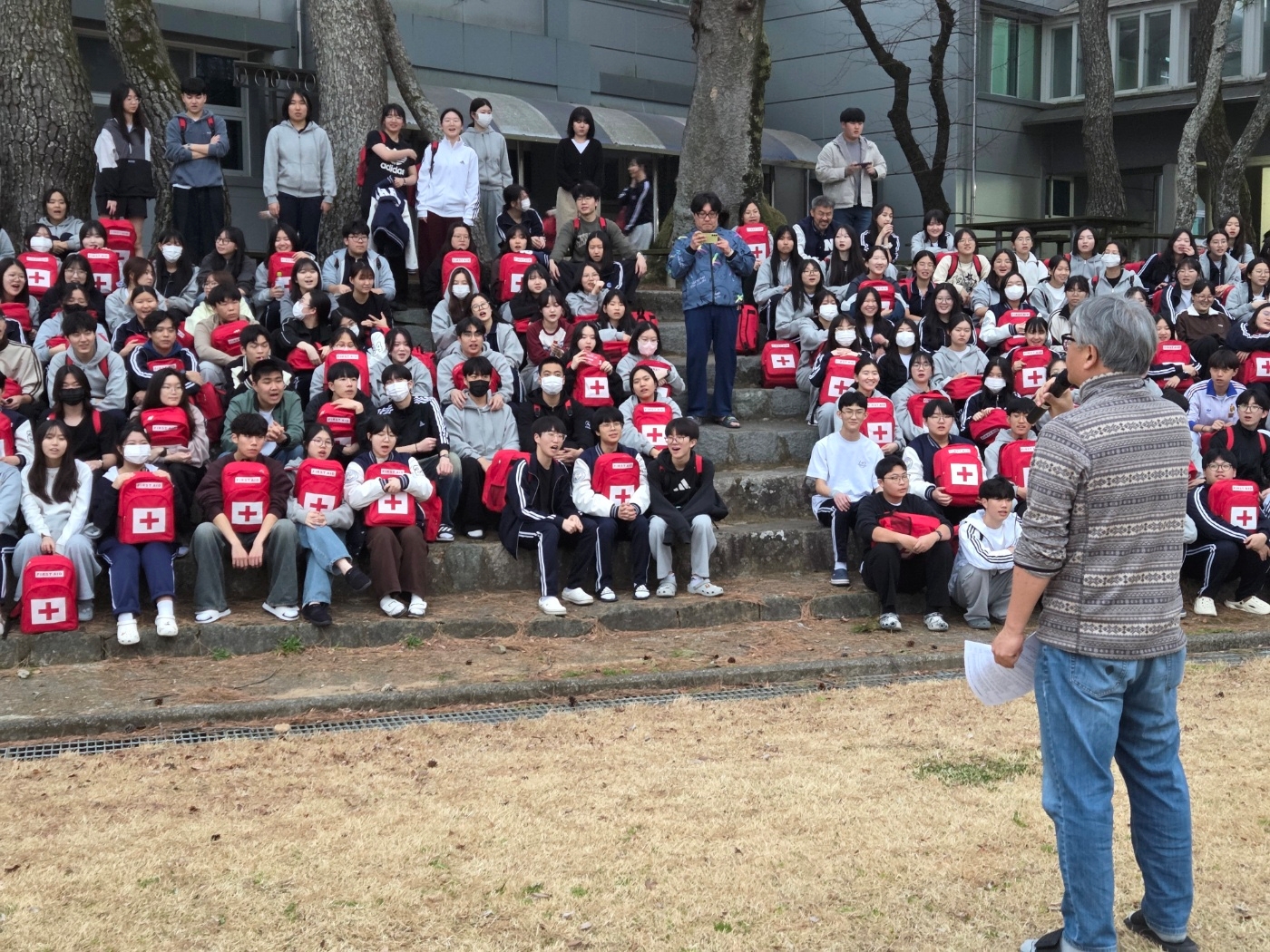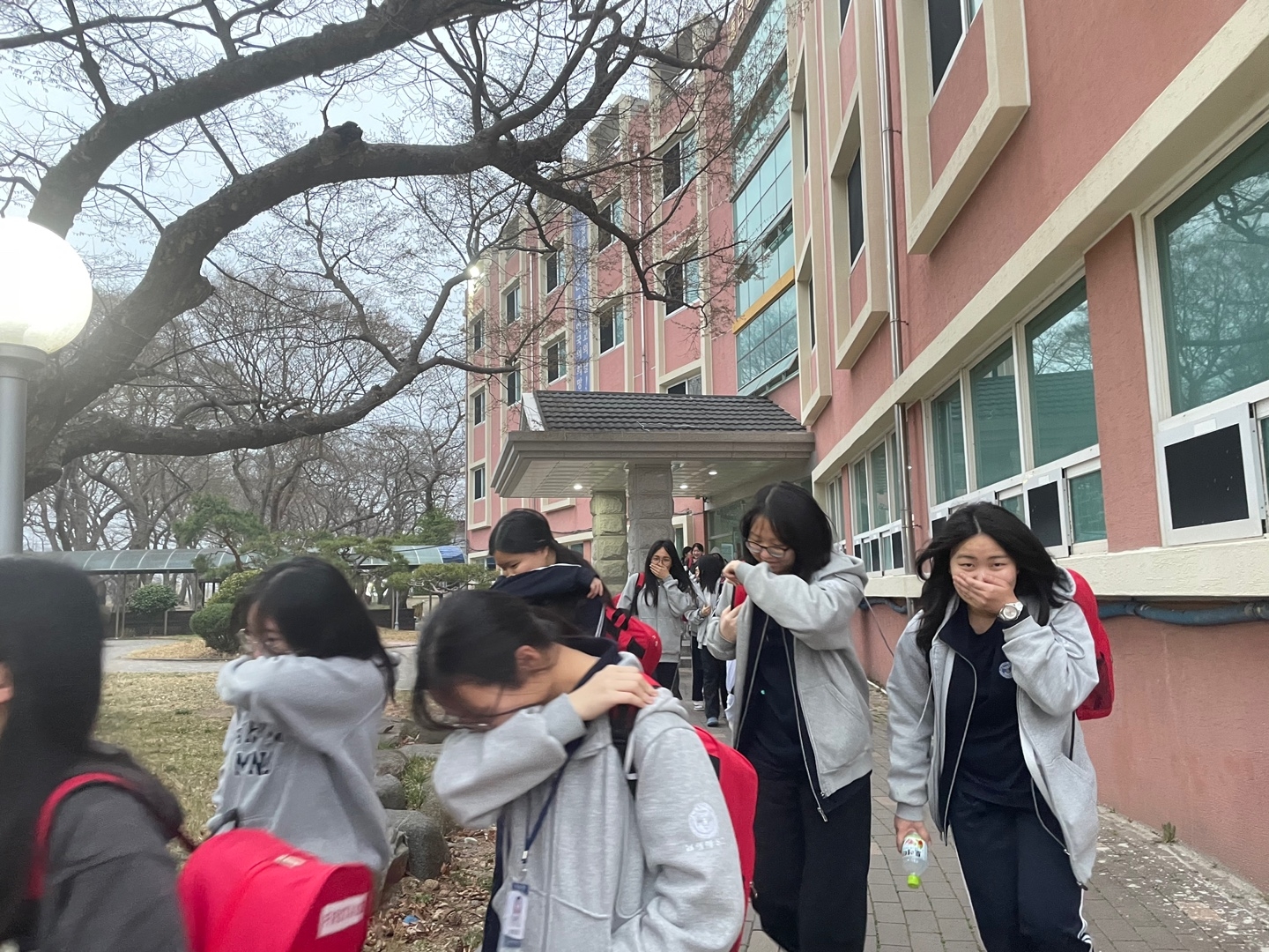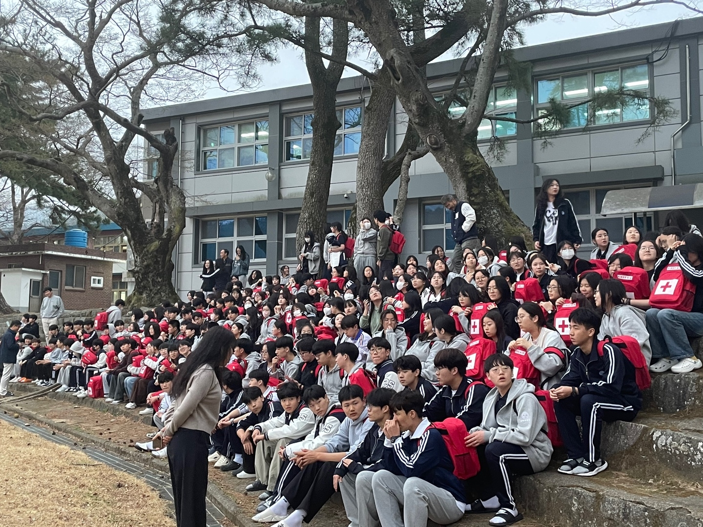 층장이 화재경보기를 울리며 "불이야"를 외치자 학생들이 각 방에 비치된 재난 가방을 가지고 운동장으로 집결하였습니다.