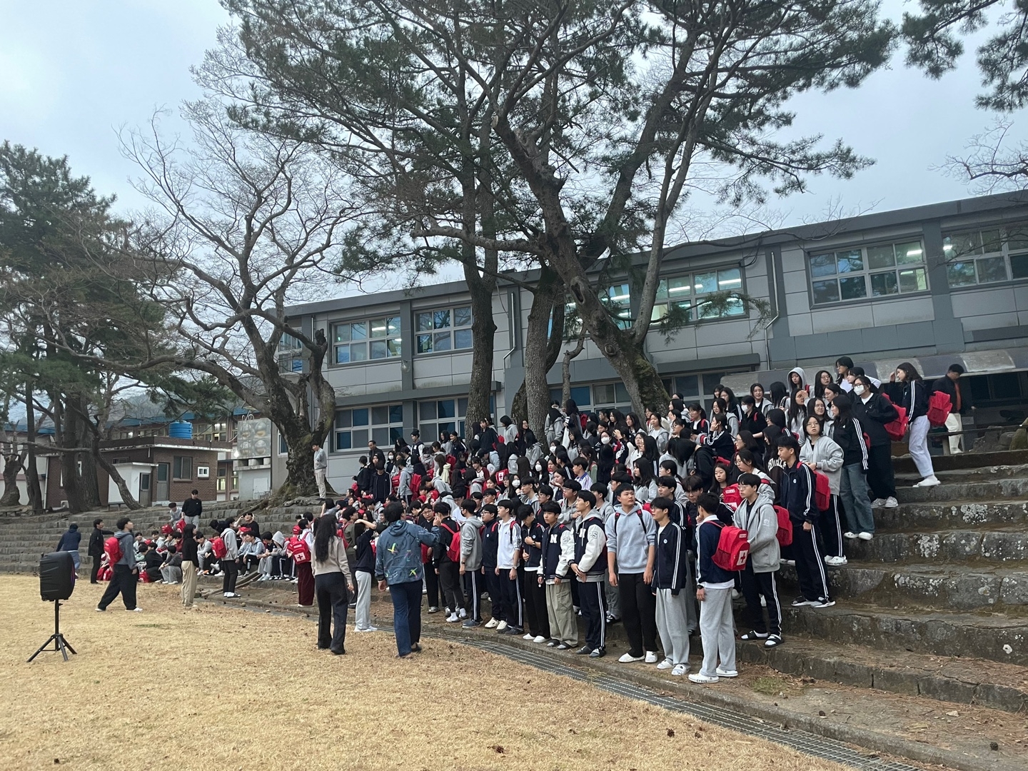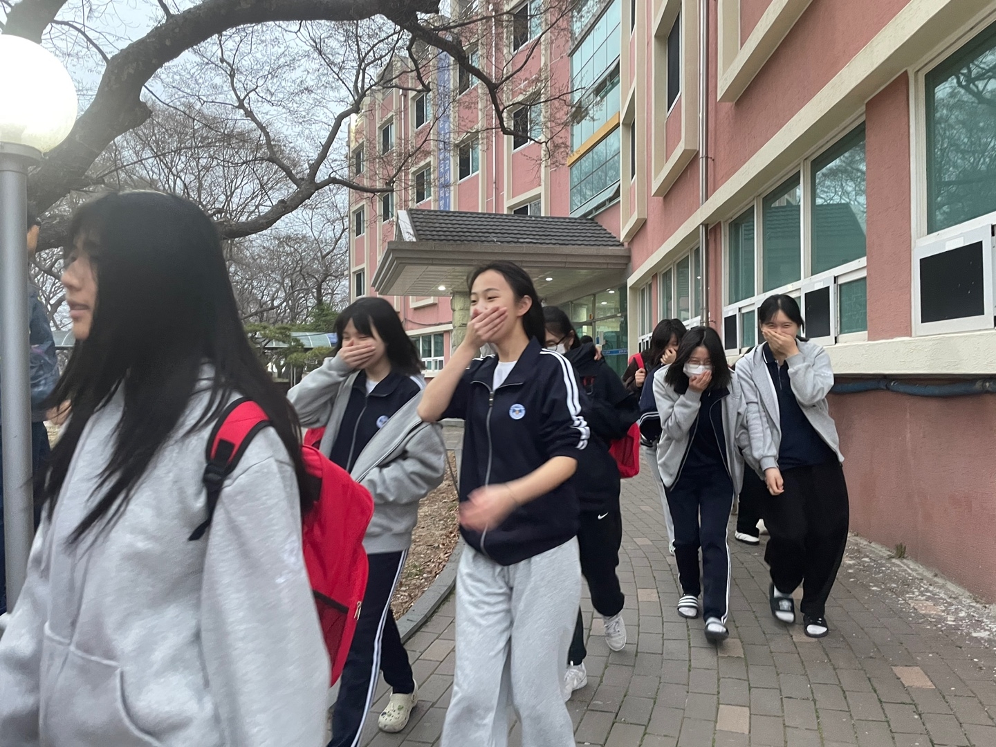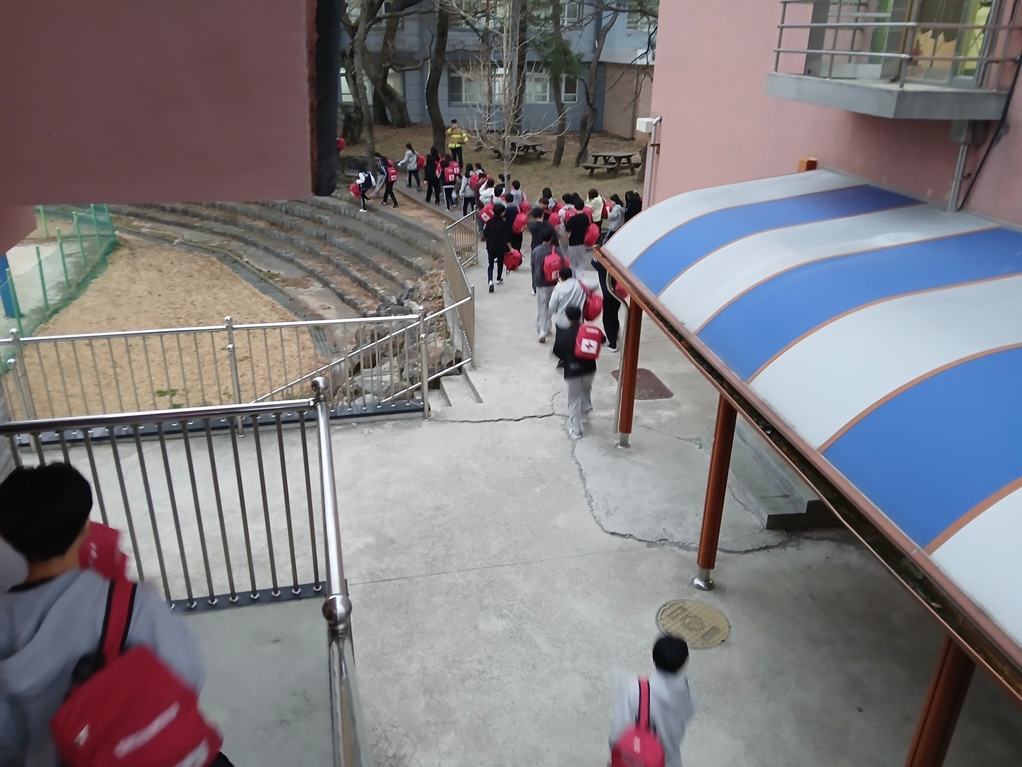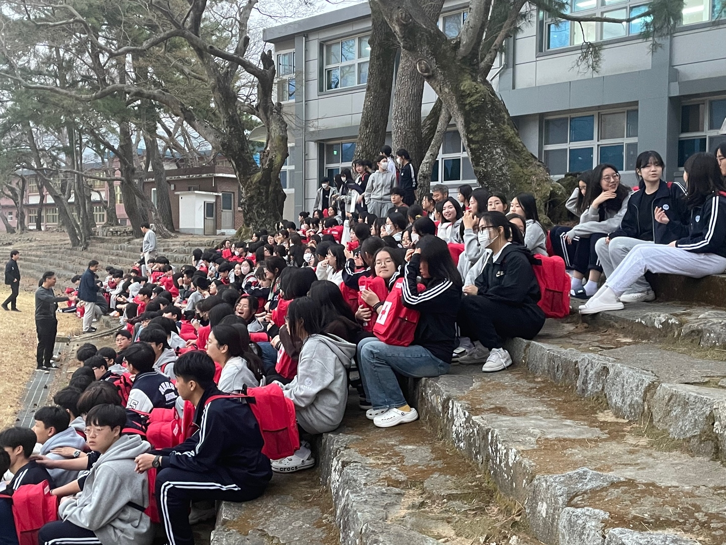 층장이 화재경보기를 울리며 "불이야"를 외치자 학생들이 각 방에 비치된 재난 가방을 가지고 운동장으로 집결하였습니다.