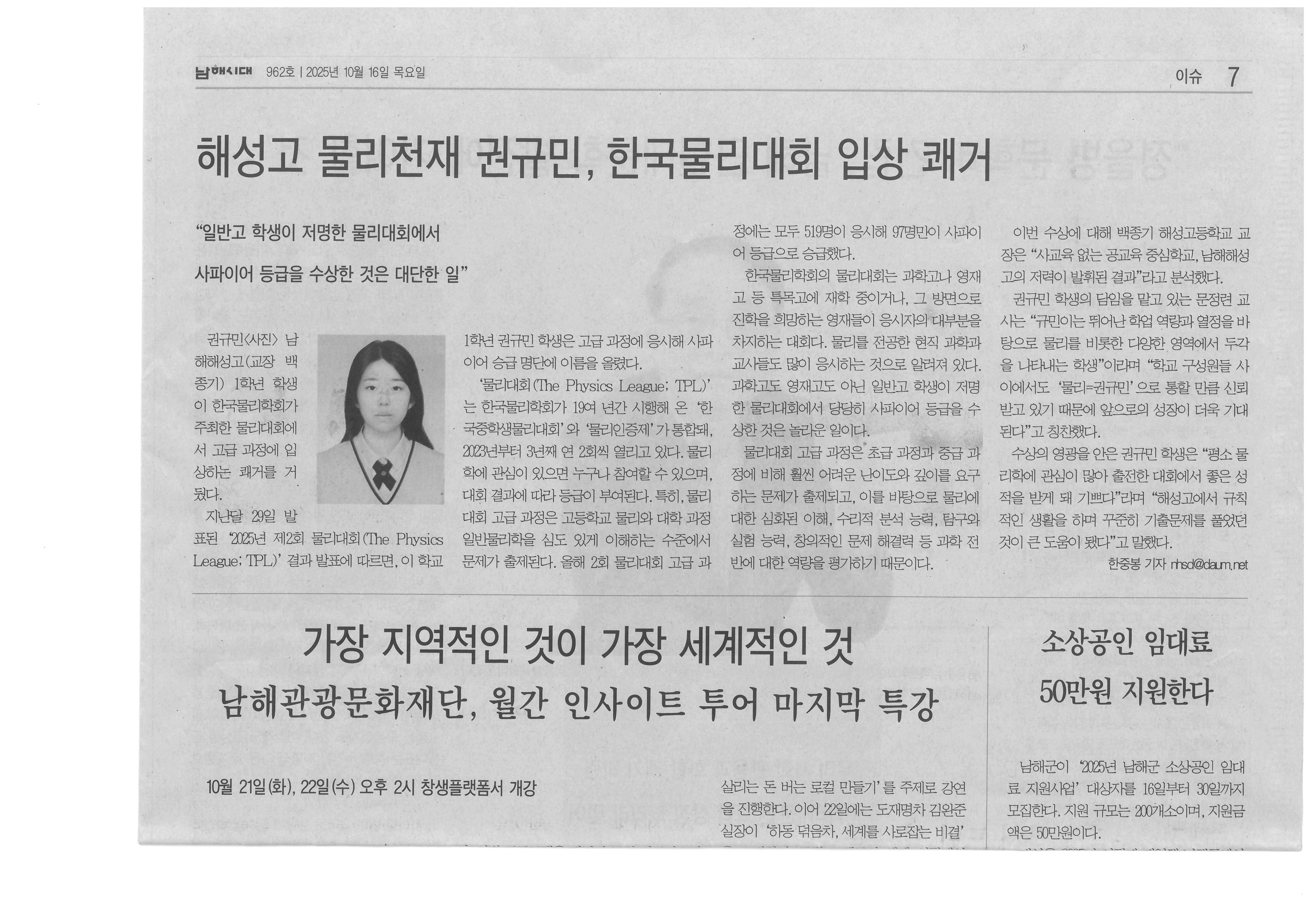 지역지 종이신문에 1학년 1반 권규민 학생의 한국물리대회 입상 소식입니다.